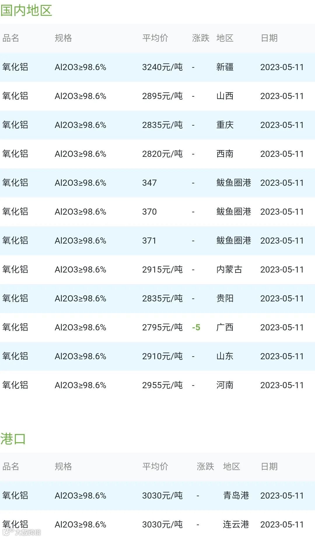 2023年05月11日氧化铝粉体材料市场参考价:
