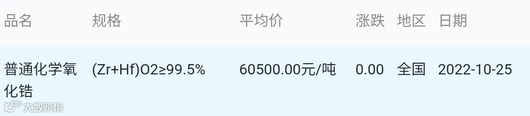2022年10月25日氧化锆材料市场参考价: