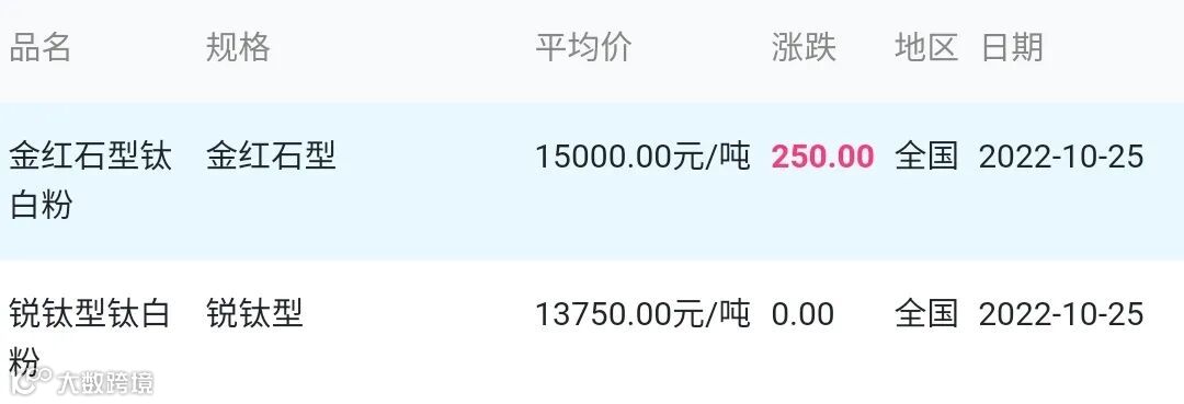 2022年10月25日钛白粉材料市场参考价: