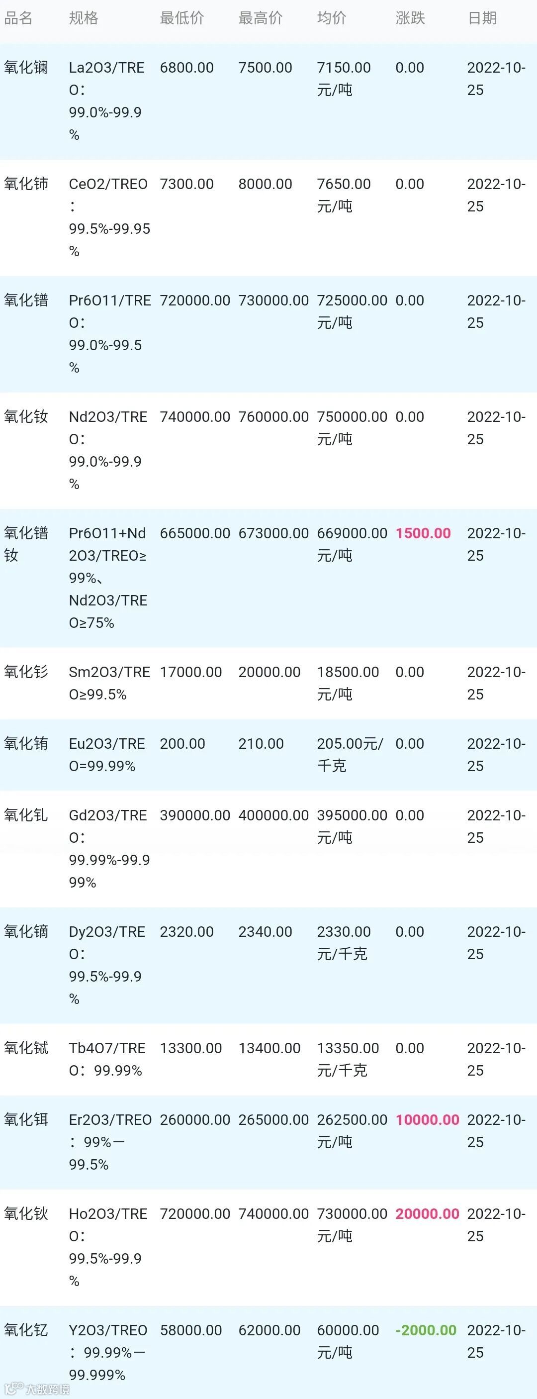 2022年10月25日稀土氧化物材料市场参考价: