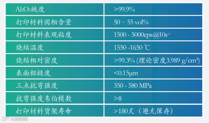 4、适配材料种类多:可适配多种低粘度打印材料,包括氧化锆、氧化铝、氧化硅、氮化硅等,材料使用寿命为180天。