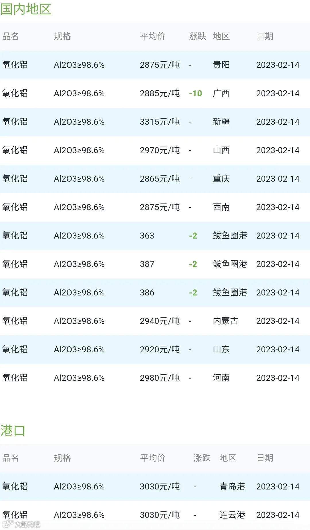 CERADIR先进陶瓷在线2023年02月14日氧化铝粉体材料市场参考价: