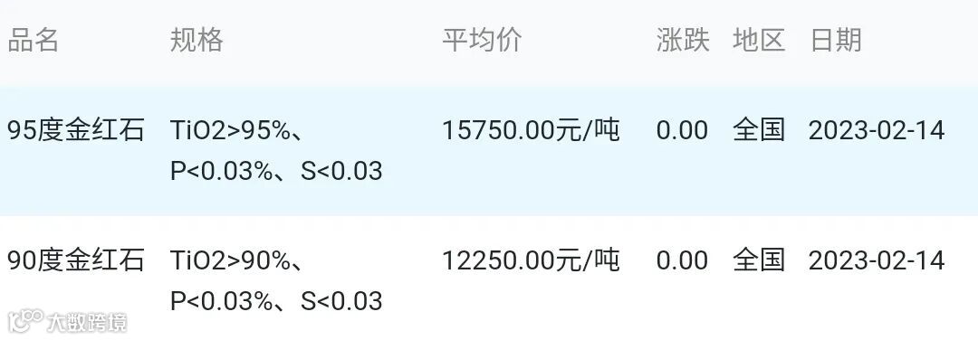 2023年02月14日金红石材料市场参考价: