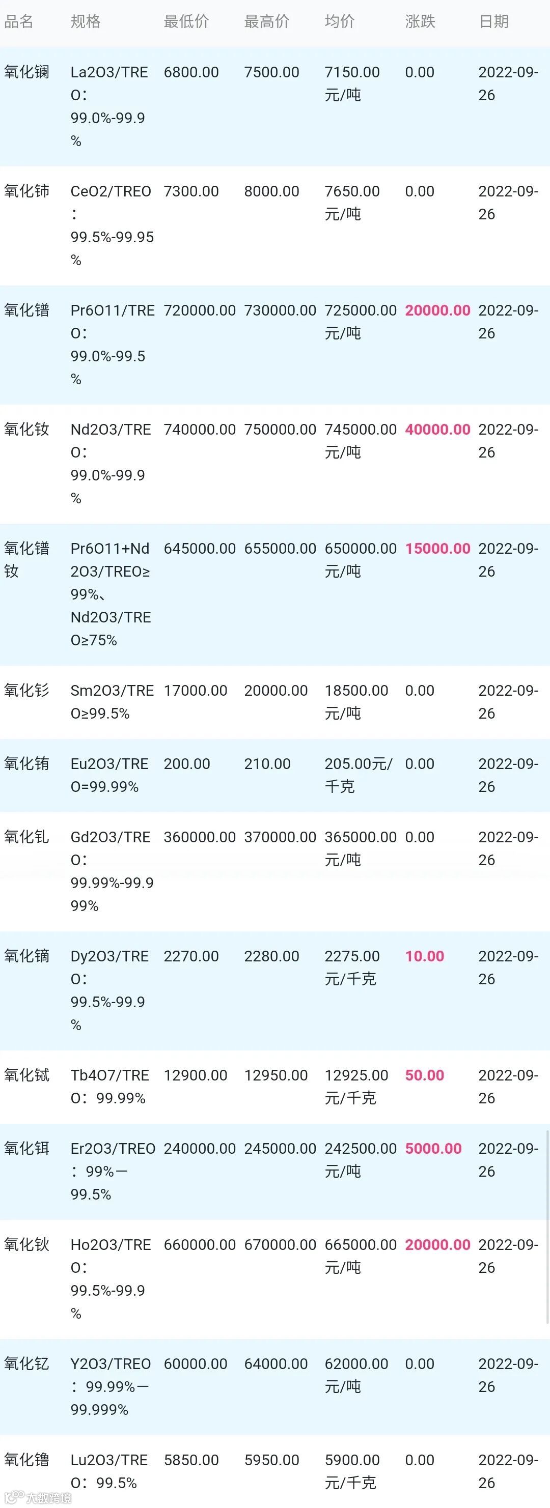 2022年09月26日稀土氧化物材料市场参考价: