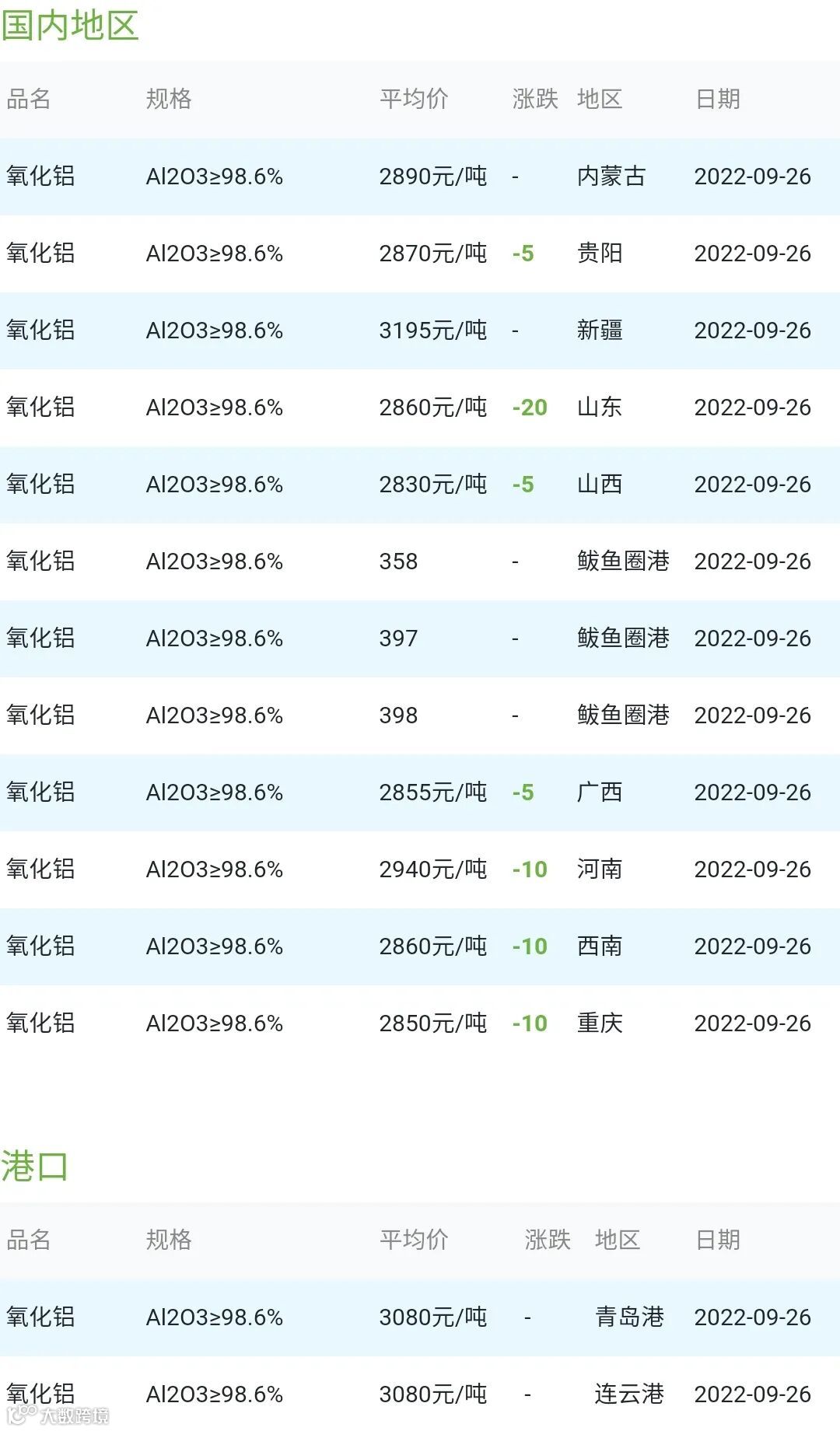 CERADIR先进陶瓷在线2022年09月26日氧化铝粉体材料市场参考价:
