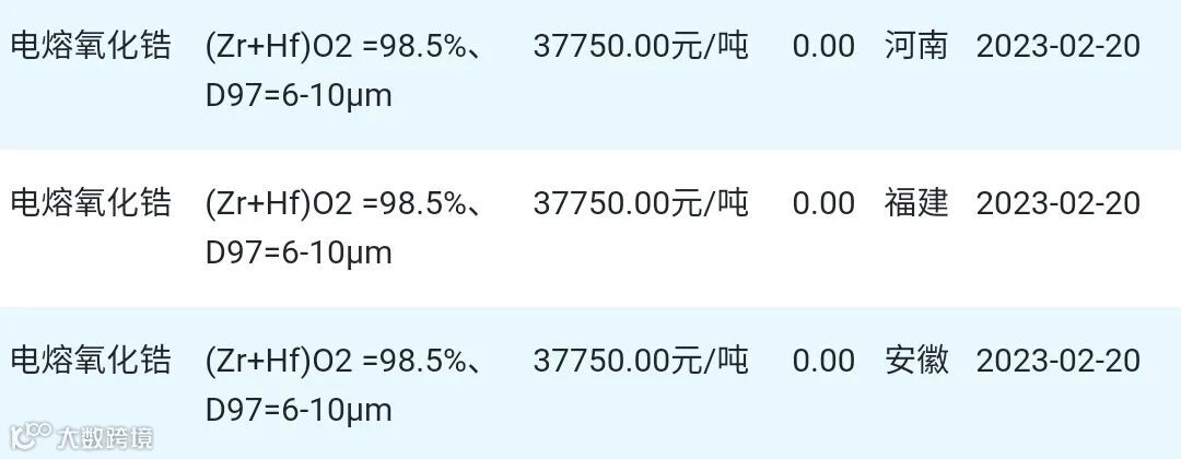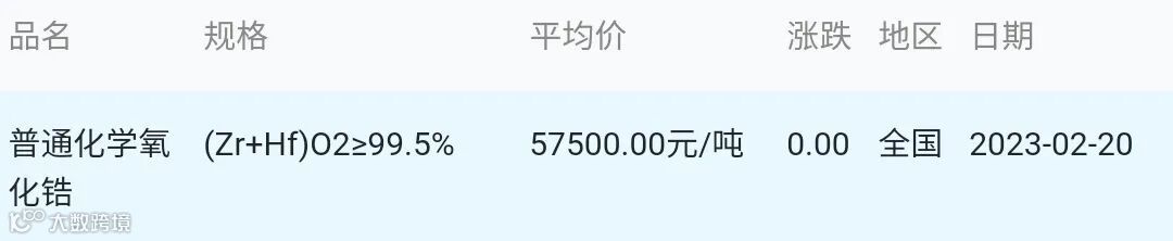 2023年02月20日氧化锆材料市场参考价:
