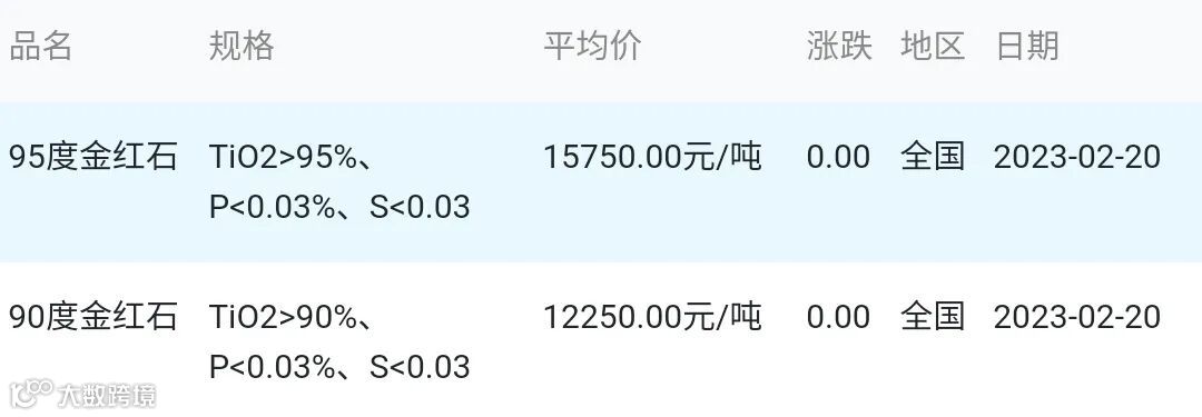 2023年02月20日金红石材料市场参考价: