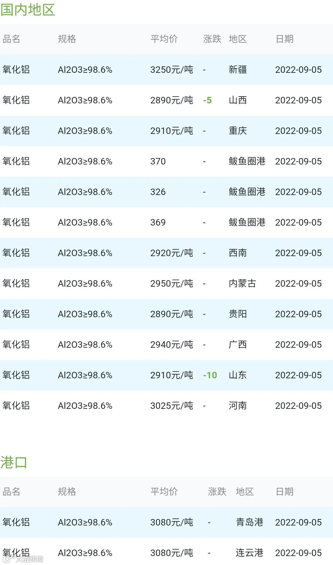 CERADIR先进陶瓷在线2022年09月05日氧化铝粉体材料市场参考价: