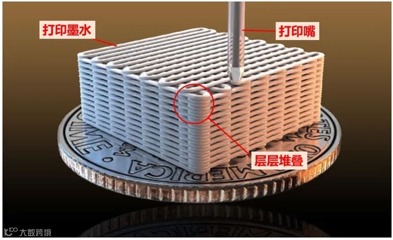 ▲墨水直写3D打印过程示意图(图片来源:U.S. LawrenceLivermore National Laboratory)