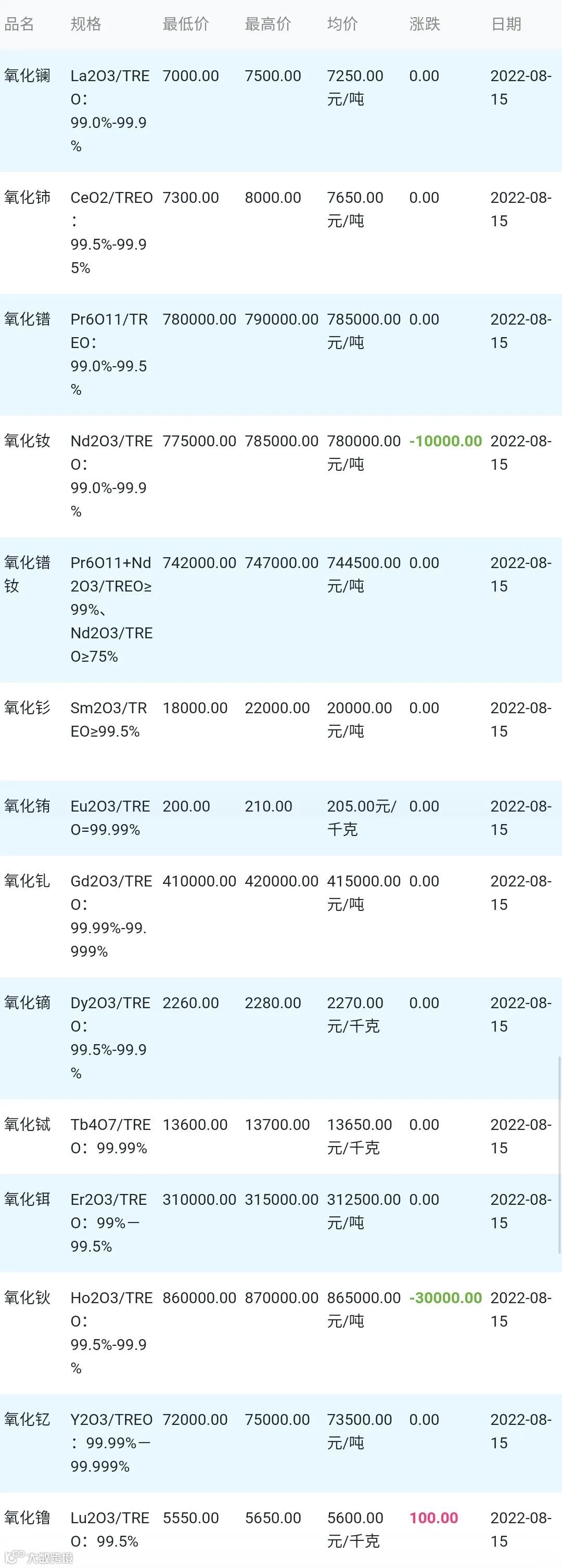 2022年08月15日稀土氧化物材料市场参考价: