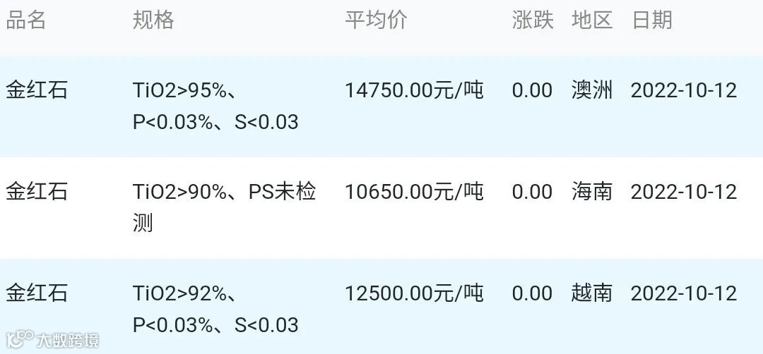 2022年10月12日金红石材料市场参考价: