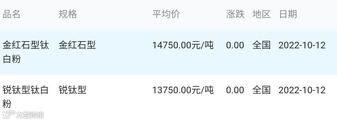2022年10月12日钛白粉材料市场参考价: