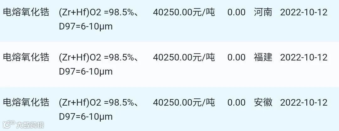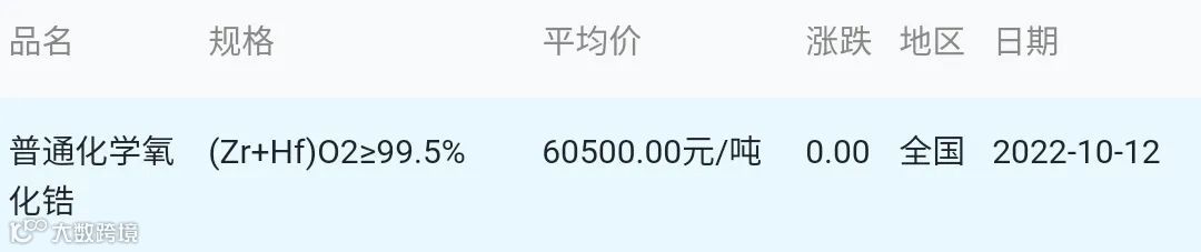 2022年10月12日氧化锆粉体材料市场参考价: