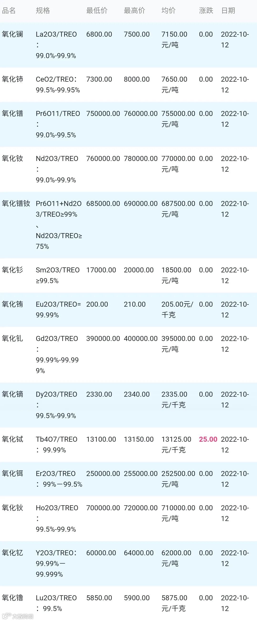 2022年10月12日稀土氧化物材料市场参考价: