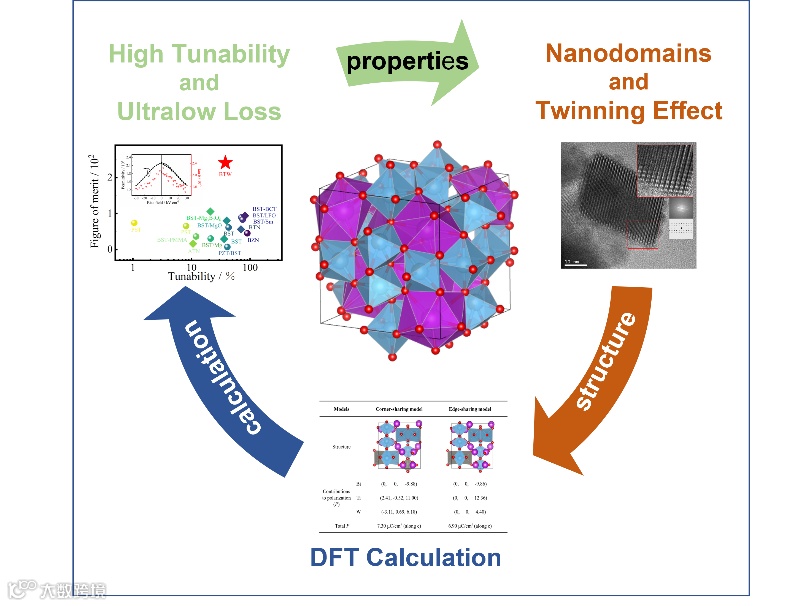 图一 非钙钛矿构型的弛豫铁电材料Bi6Ti5WO22的性能-结构-模拟计算示意图
