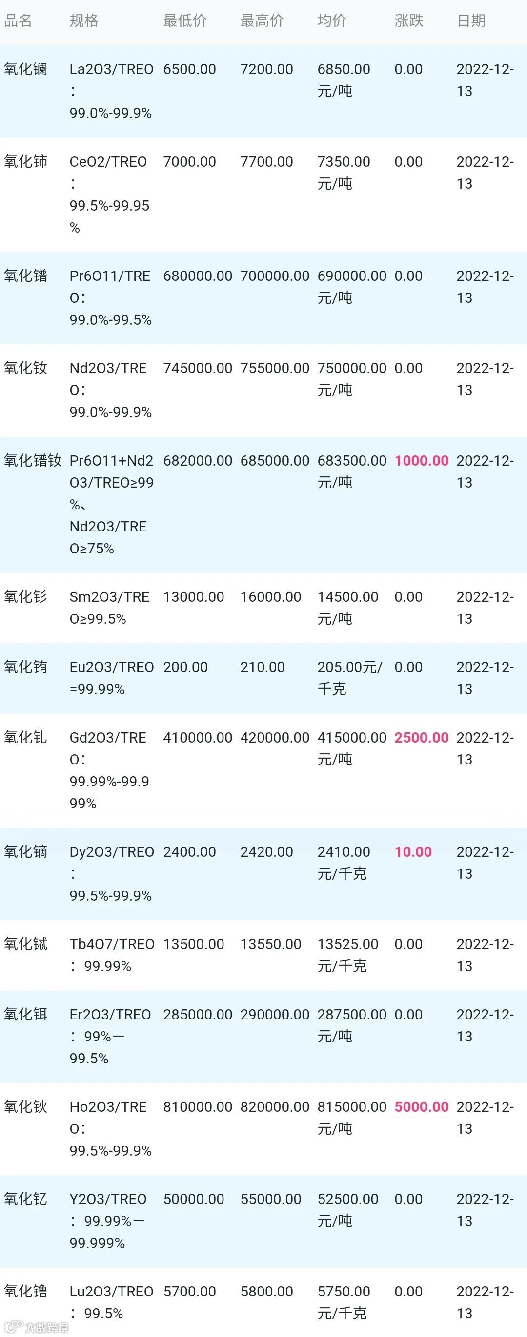 2022年12月13日稀土氧化物材料市场参考价: