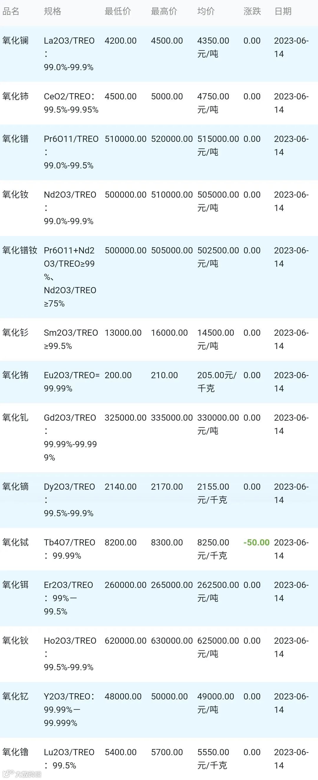 2023年06月14日稀土氧化物材料市场参考价:
