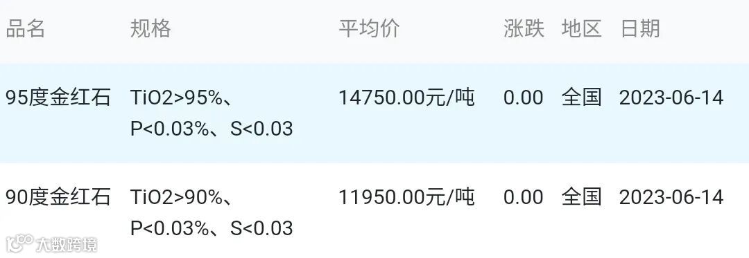 2023年06月14日金红石材料市场参考价: