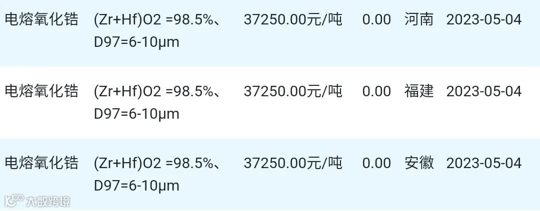 2023年05月04日氧化锆材料市场参考价: