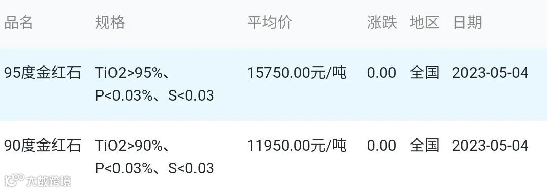 2023年05月04日金红石材料市场参考价: