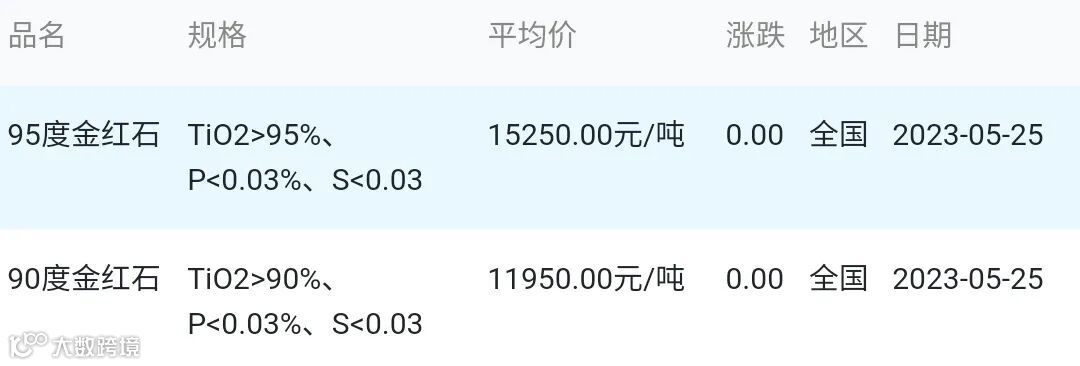 2023年05月25日金红石材料市场参考价: