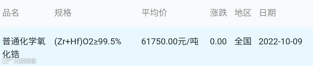 CERADIR先进陶瓷在线2022年10月09日氧化锆材料市场参考价: