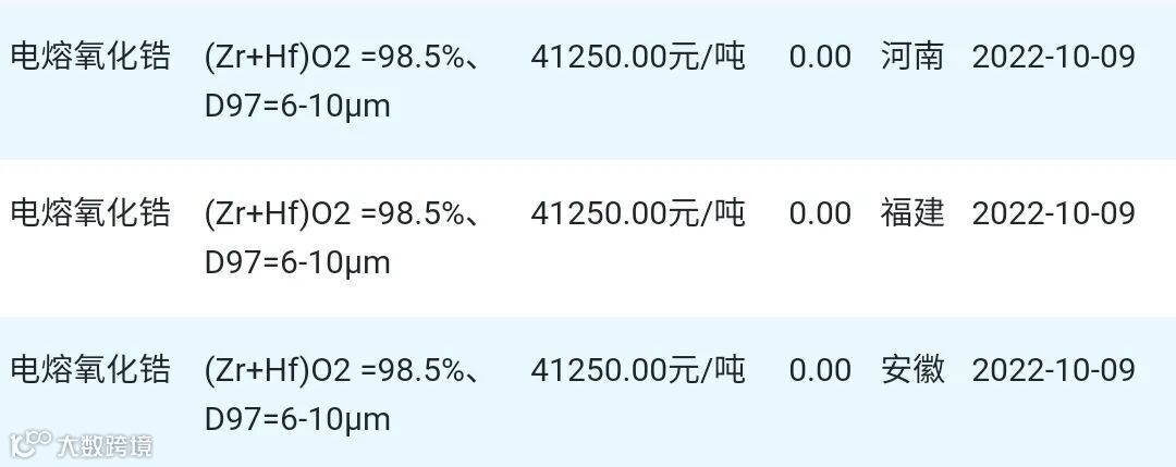 2022年10月09日氧化锆材料市场参考价: