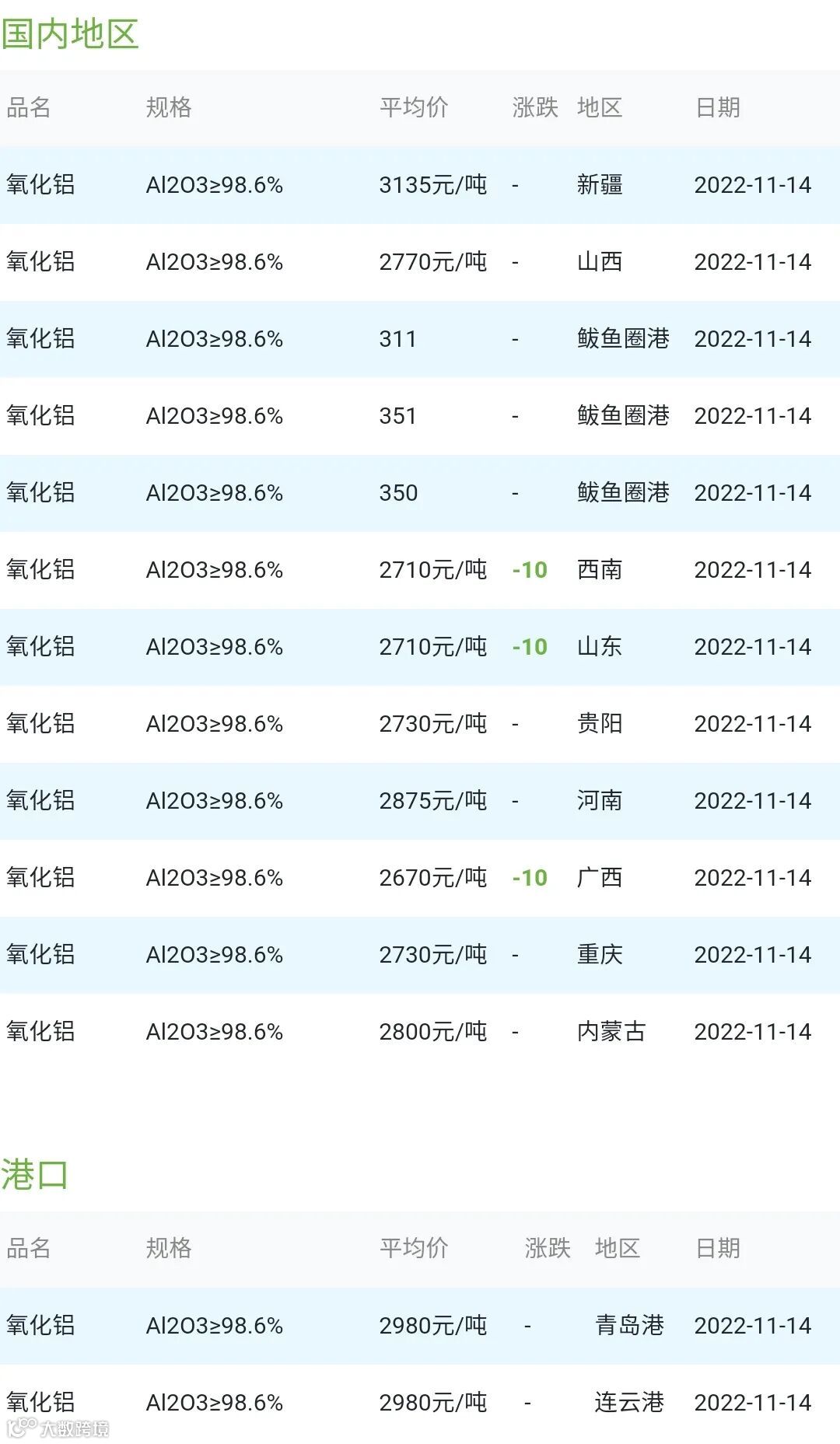 CERADIR先进陶瓷在线2022年11月14日氧化铝材料市场参考价: