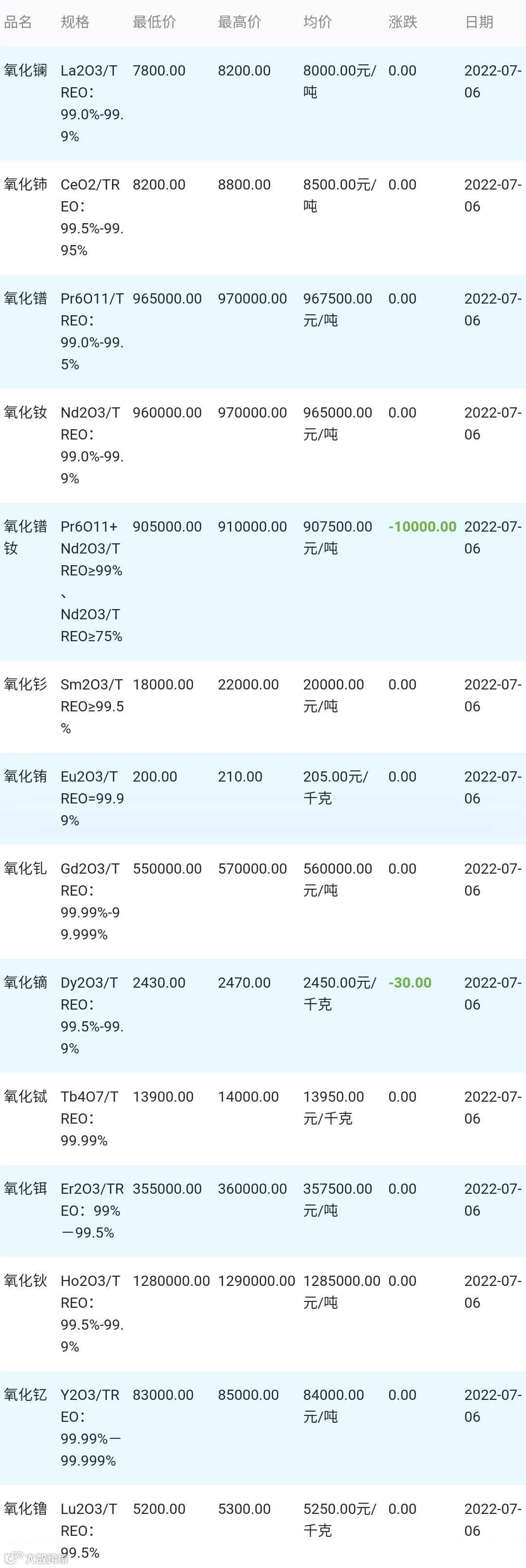 2022年07月06日稀土氧化物材料市场参考价: