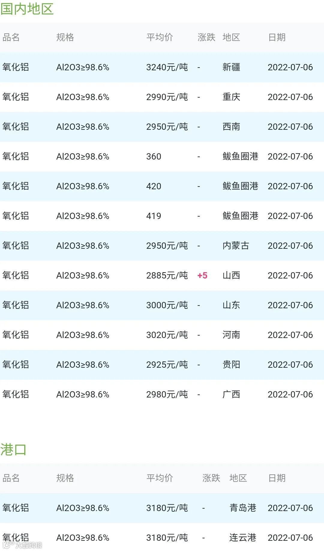 CERADIR先进陶瓷在线2022年07月06日氧化铝粉体材料市场参考价: