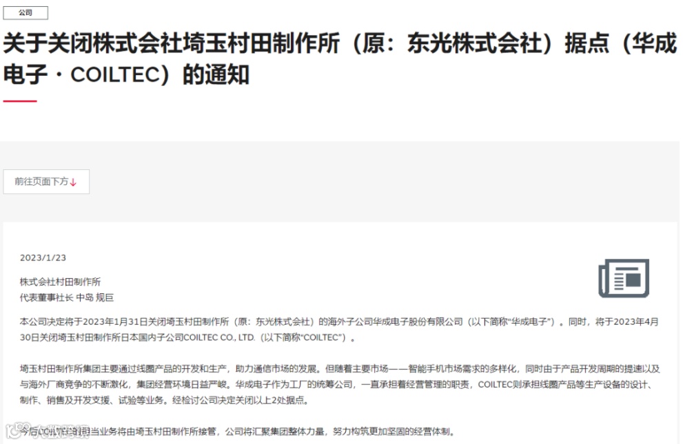 根据公告显示,村田已于今年1月31日关闭其在中国台湾的海外子公司华成电子股份有限公司(