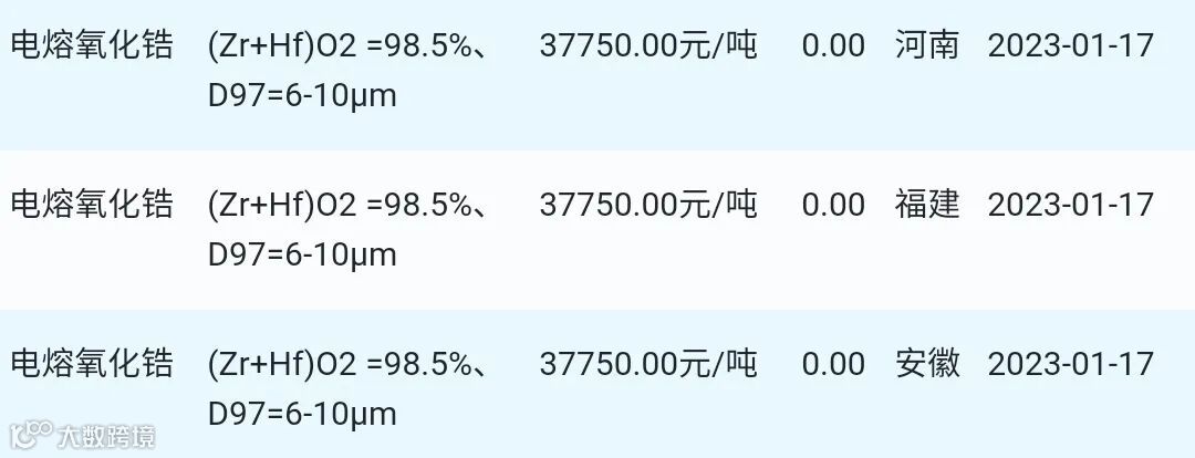2023年01月17日氧化锆材料市场参考价: