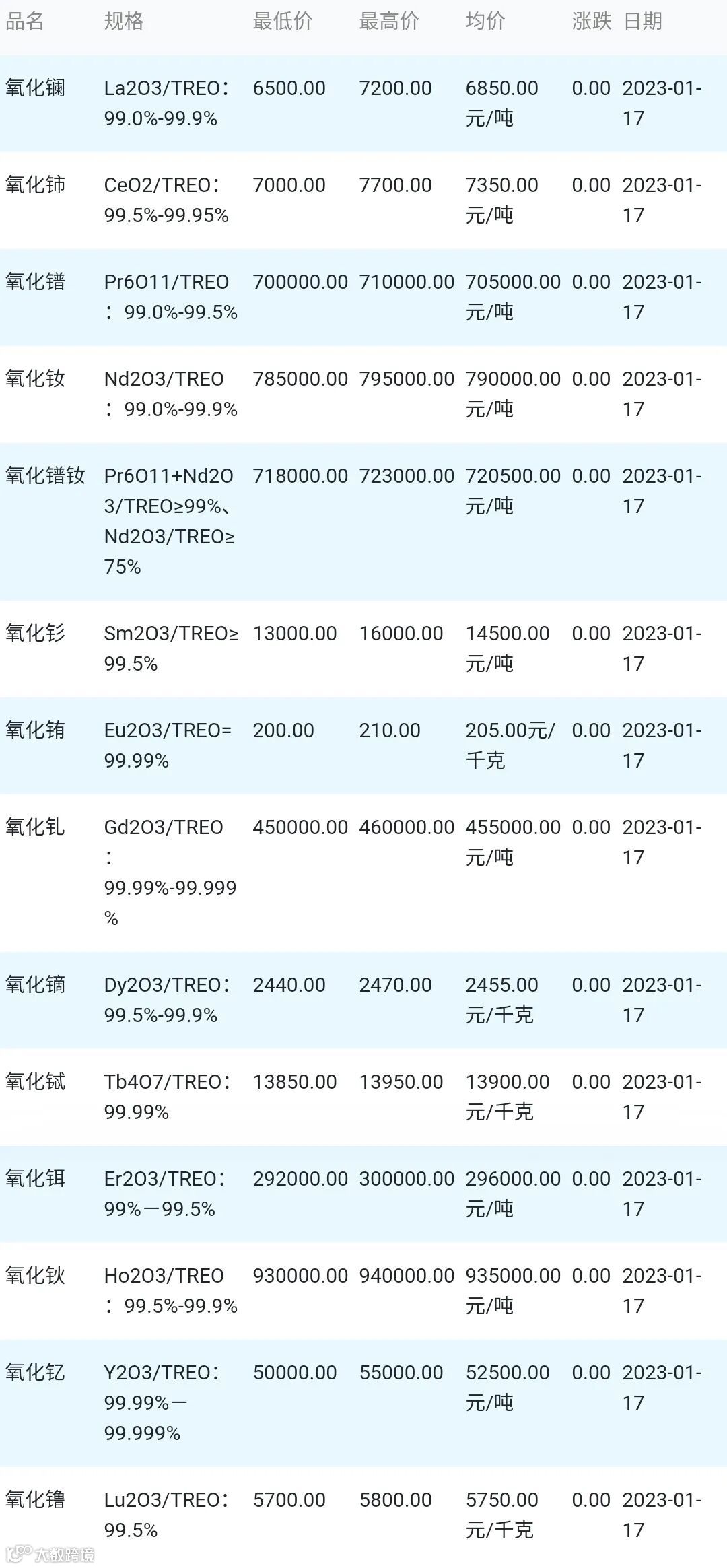 2023年01月17日稀土氧化物材料市场参考价: