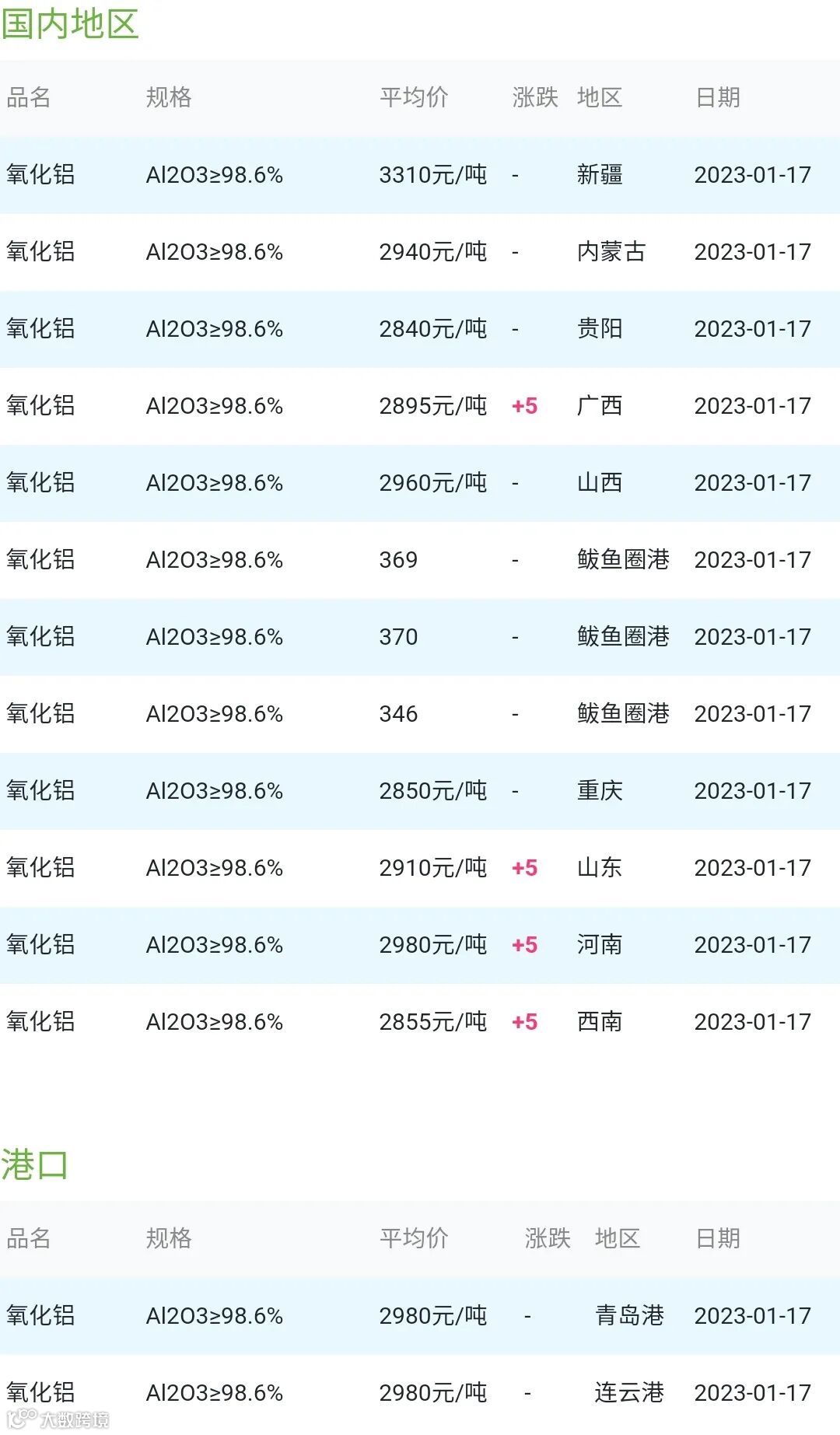 2023年01月17日氧化铝粉体材料市场参考价: