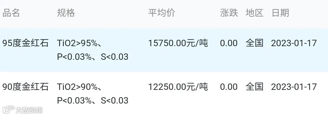 2023年01月17日金红石材料市场参考价: