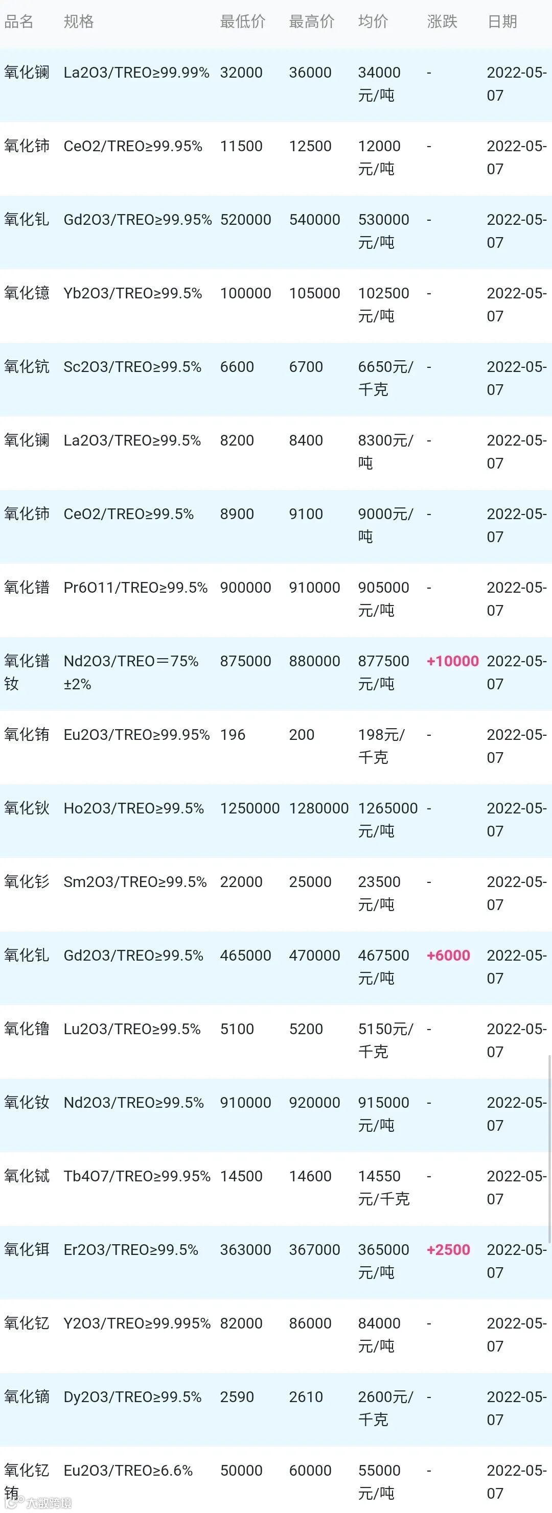 2022年05月07日稀土原料市场参考价: