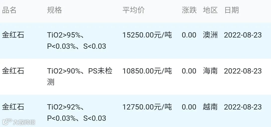 2022年08月24日金红石材料市场参考价: