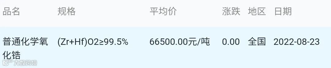 2022年08月24日氧化锆材料市场参考价: