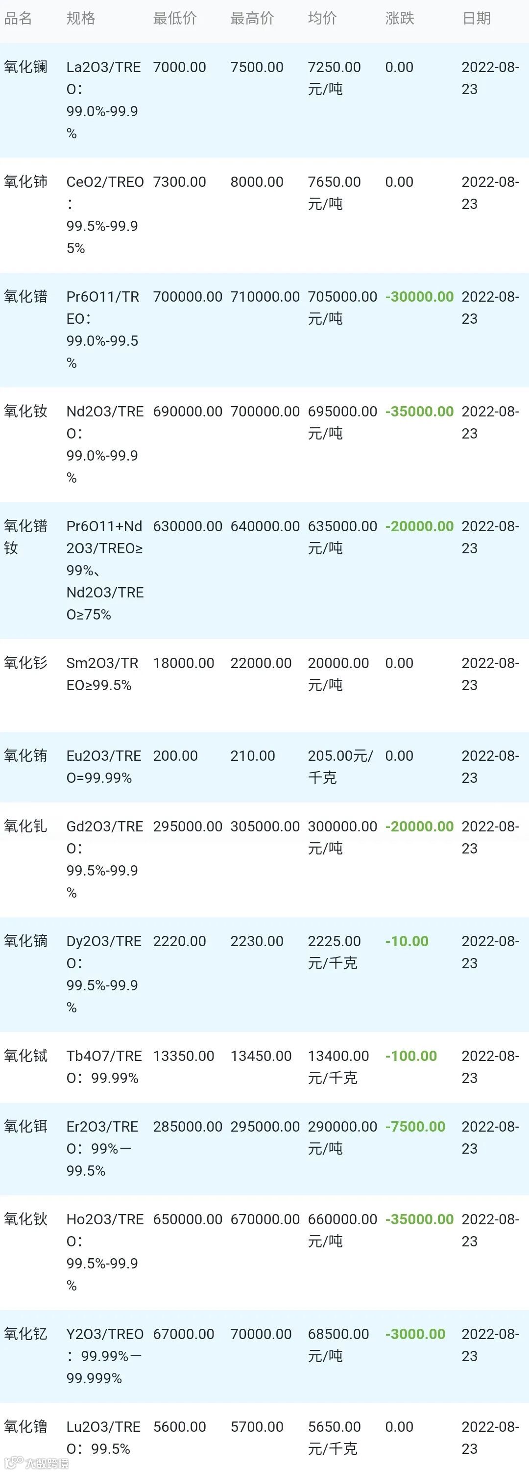 2022年08月24日稀土氧化物材料市场参考价: