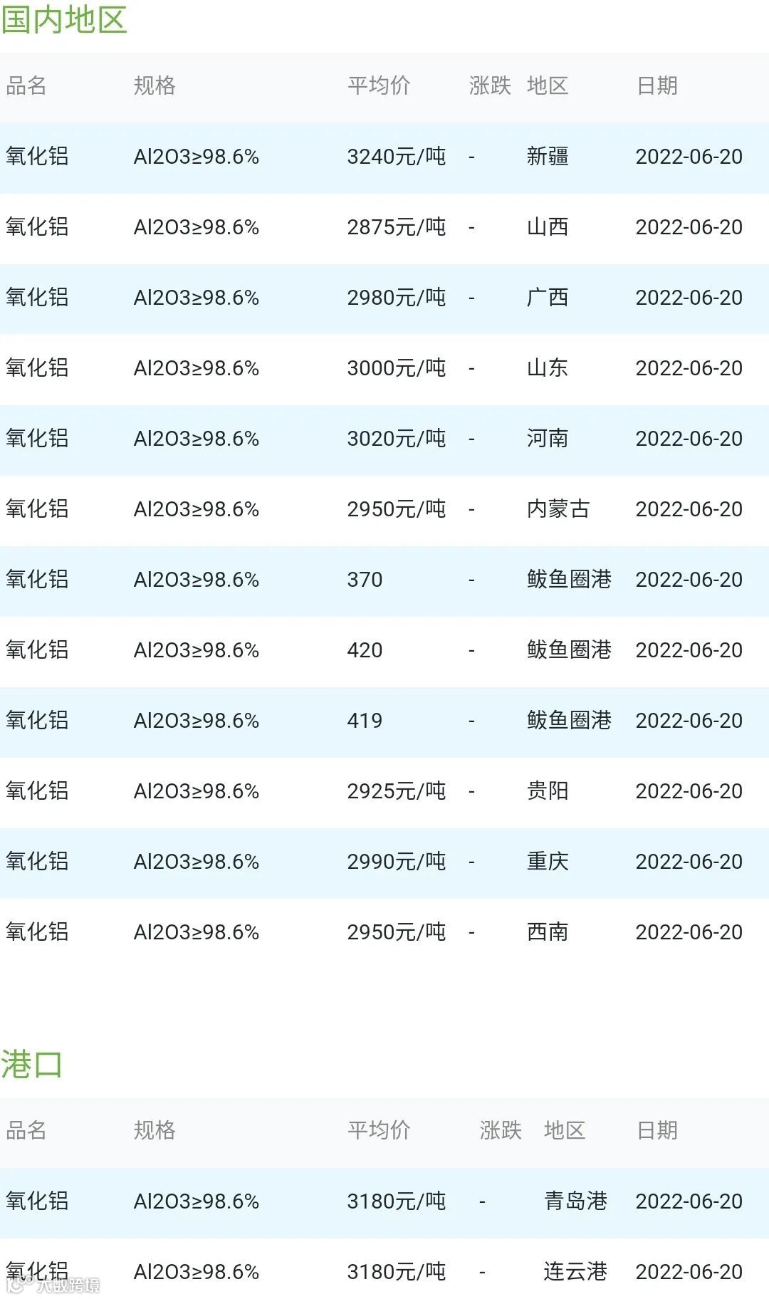 2022年06月20日氧化铝粉体材料市场参考价: