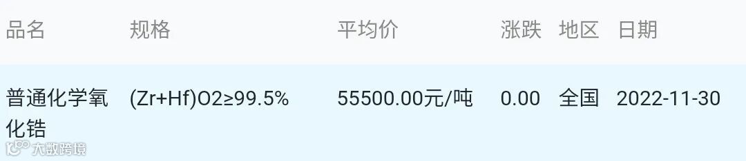 2022年11月30日氧化锆材料市场参考价: