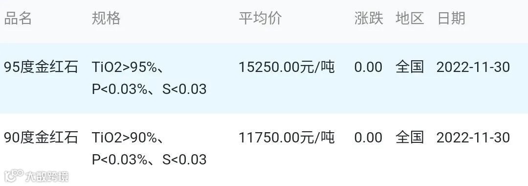 2022年11月30日金红石材料市场参考价: