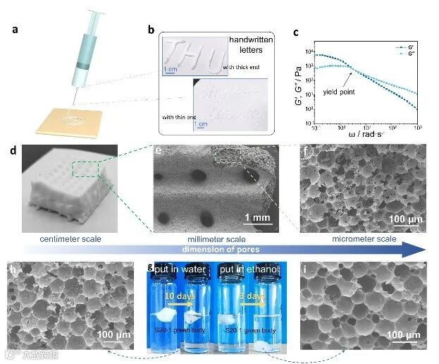 同时,该体系的泡沫坯体可以用作3D打印直写(DIW)技术,制备不同形状的泡沫陶瓷材料。所制得的未经烧结的坯体可在水的环境下维持10天(或更长