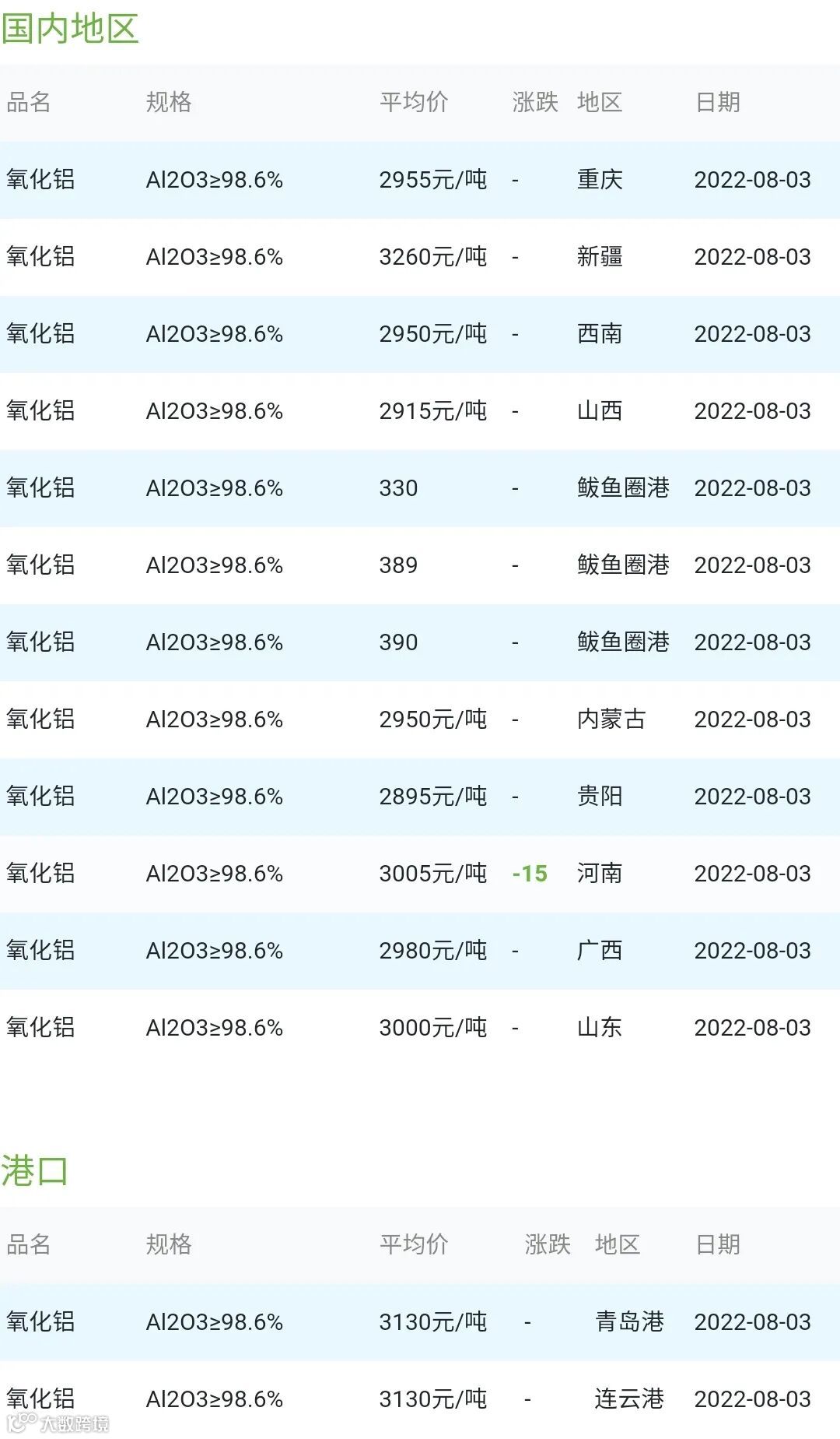 CERADIR先进陶瓷在线2022年08月03日氧化铝粉体材料市场参考价: