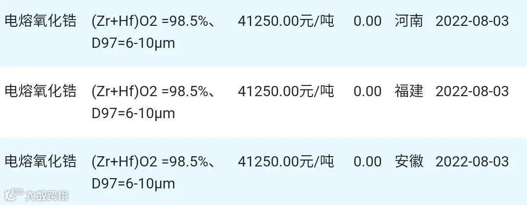 2022年08月03日氧化锆材料市场参考价: