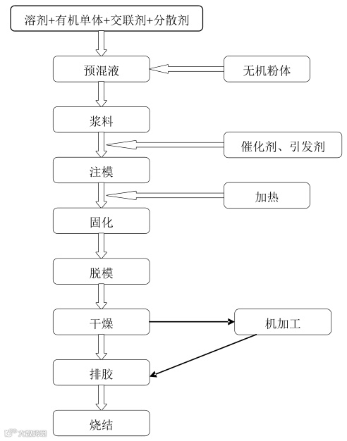 凝胶注模成型工艺将高分子聚合物化学和流变学结合起来,基本原理是在高固相含量(体积分数≥50%)、低粘度(<1Pa·s)的陶瓷浆料中掺入低浓度的有机单体,再加入引发剂并浇注,然后使浆料中的有机单体在一定条件下发生原位聚合反应,形成坚固的交联网状结构,使浆料立即原位凝固,从而使陶瓷坯体原位定形,最后经过脱模、干燥、排胶(去除有机物)、烧结后得到所需的陶瓷零件。