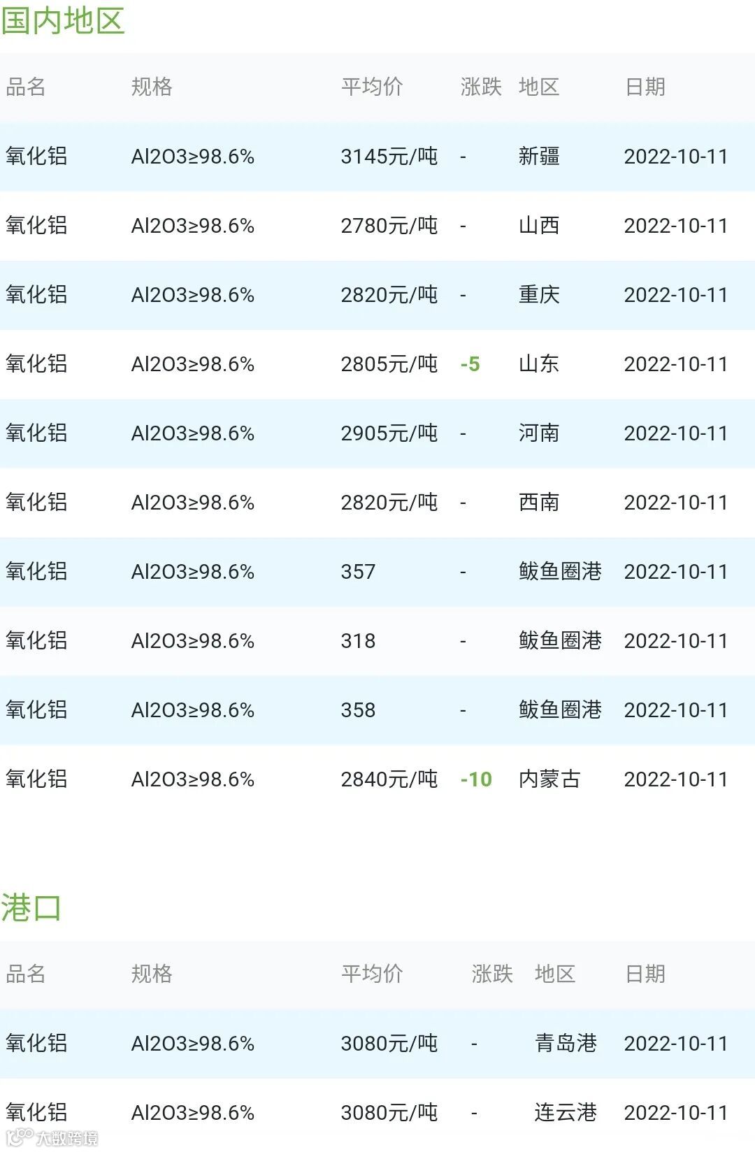 2022年10月11日氧化铝粉体材料市场参考价:
