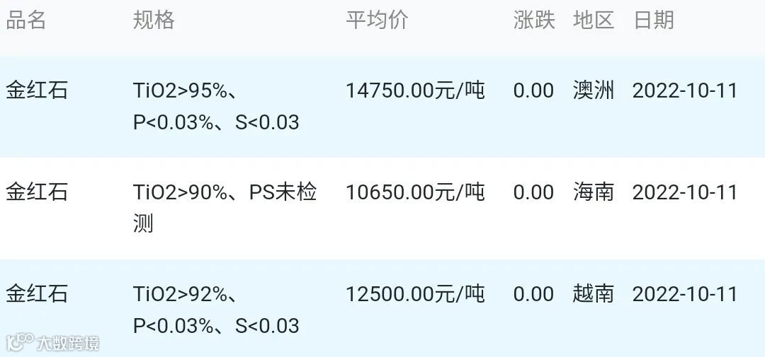 2022年10月11日金红石材料市场参考价: