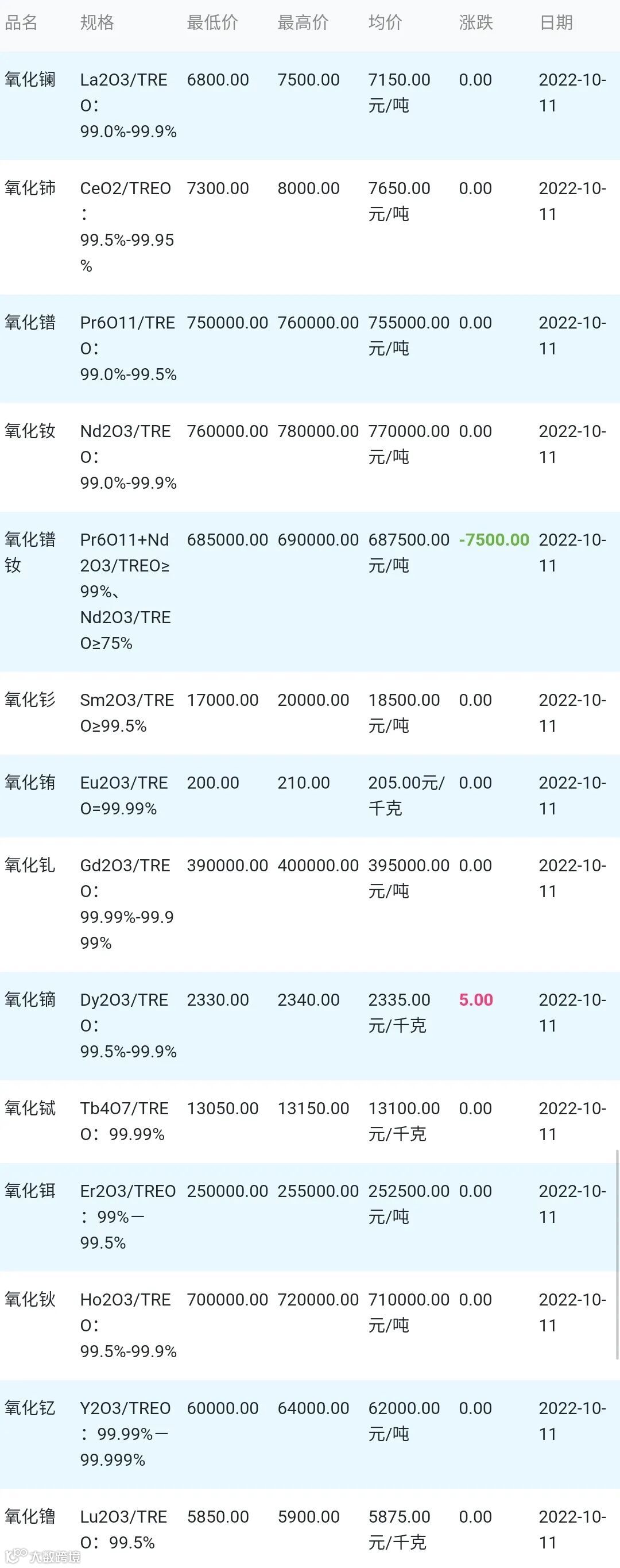 2022年10月11日稀土氧化物材料市场参考价: