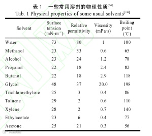 流延成型是一种流体成型的过程,粉体应该像流体一样具有流动性,因此需要选择合适的溶剂,将粉体配制成浆料。溶剂需要满足以下三个特征:(1)溶解粉体。(2)使粉体和其他添加剂均匀化。(3)蒸发速度快且无污染。溶剂通常选择水、乙醇、甲苯、三氯乙烷、丙酮或者几种溶剂组合,各种溶剂的物理性质列于表 1。